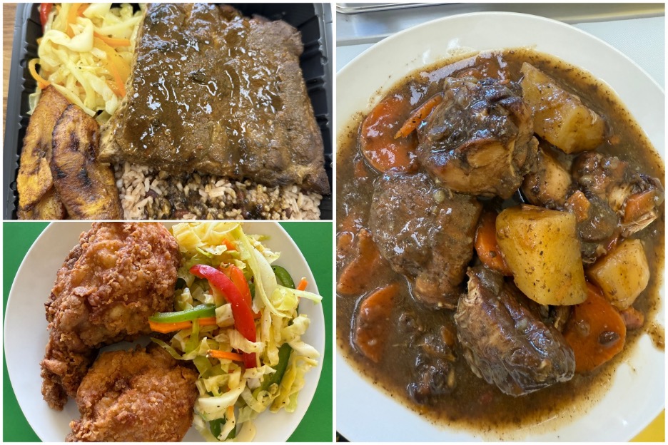 House specialty Jerk Oxtails with white rice, Heim Oxtails with rice and peas; Photos by Island Breeze Jamaican Restaurant