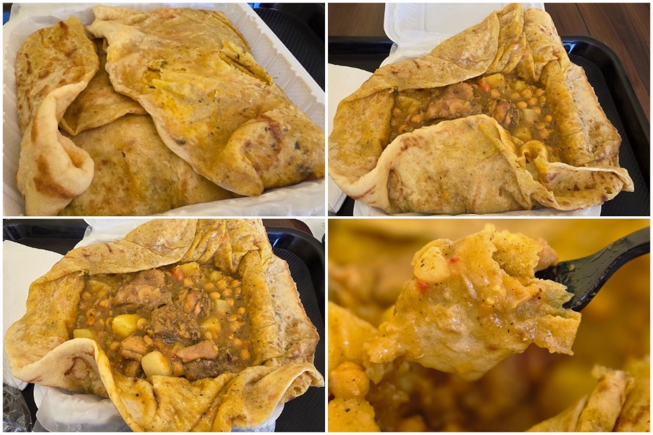 Roti, Roti inside, Roti and Chicken, Potatoes, Chickpeas on a fork; Photos by Nick Rama