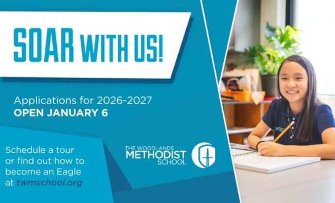 Come SOAR with us! The Woodlands Methodist School serves PreK through 8th grade. Find out how to become an Eagle and schedule a tour by calling 281-822-8220 or visit twmcschool.org.