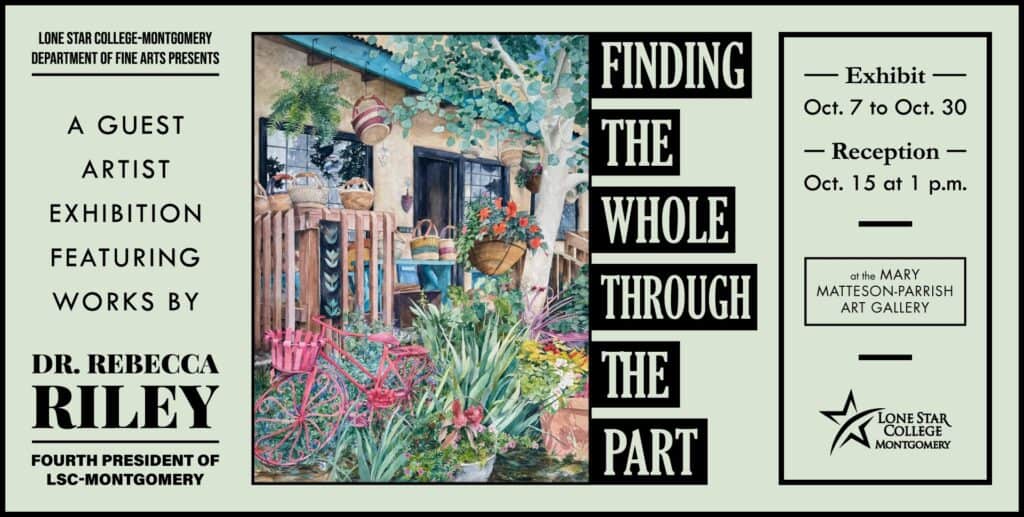 The Lone Star College–Montgomery Art Department is proud to present an exclusive exhibition by Dr. Rebecca Riley, the college’s fourth president and a lifelong artist. Her solo show, Finding the Whole through the Part, opened this October in the Mary Matteson-Parrish Art Gallery, with a special guest reception being held on October 15 from 1–2 p.m. on the LSC–Montgomery campus.