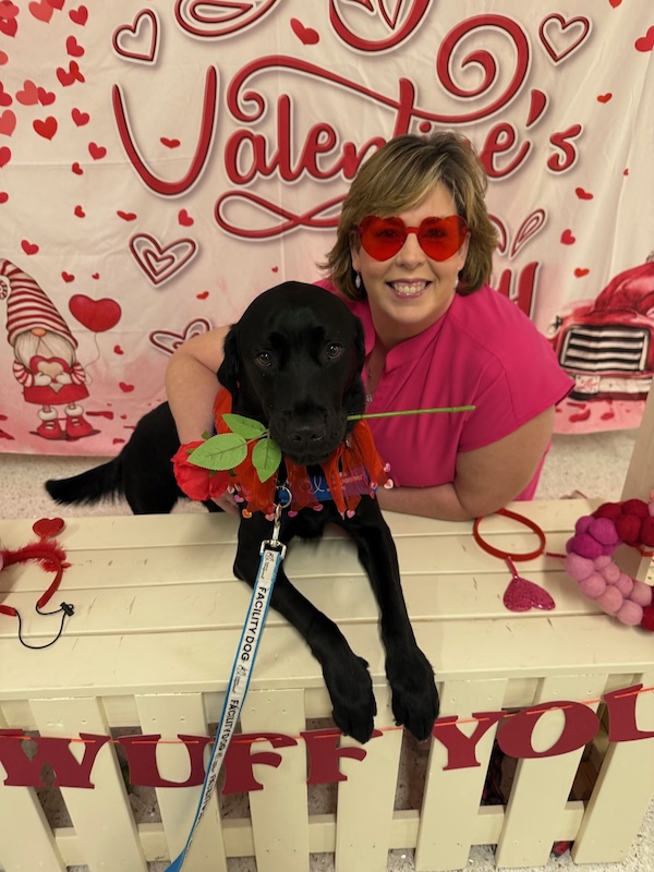 Memorial Hermann The Woodlands Medical Center has it’s very own Facility Dog named Kinson. He and his handler, Ashley Halland, LCSW, started the program to work with patients back in August 2023. In honor of Valentine’s Day and National Heart Month, Kinson was the headline at the annual “Smooch the Pooch” interactive photo booth and cuddle session. Hospital employees, affiliated physicians and visitors alike were welcome to drop by a fun-filled booth for a meet and greet along with a chance to relieve any stress.