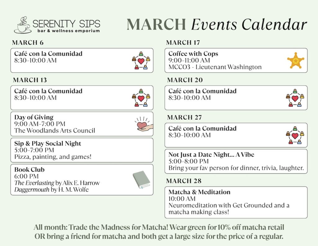 March 2026 – Events at Serenity Sips – At Serenity Sips, they’ve reimagined what a wellness café can be. Designed for those seeking a space to work, recharge, and make healthier choices, we’re more than just a place to grab a drink—they’re your destination for balance, renewal, and connection. Serenity Sips is where community and wellness come together in harmony. From their welcoming café atmosphere to thoughtfully selected wellness services and products, every detail is crafted to create a space that works for you. Come see how Serenity Sips is transforming the way you care for yourself, one visit at a time! Learn more by visiting Serenity Sip’s Event Calendar here