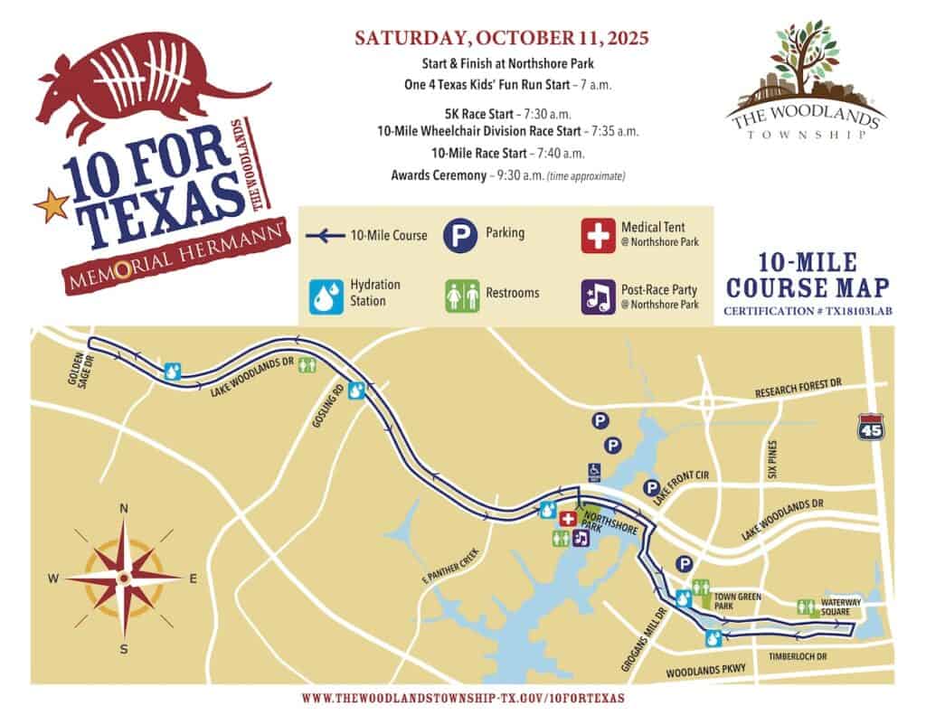 The Memorial Hermann 10 for Texas 10-mile road race, 3.1 Armadillo Run 5K and One 4 Texas Kids’ Fun Run is set for Saturday, October 11, 2025, beginning at 7 a.m. The USA Track and Field (USATF) sanctioned event will feature more than 1,200 registered participants racing through The Woodlands, making their way to the finish line in Northshore Park.