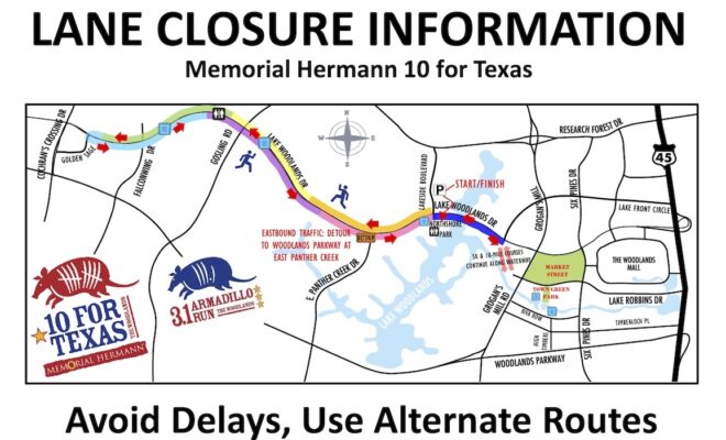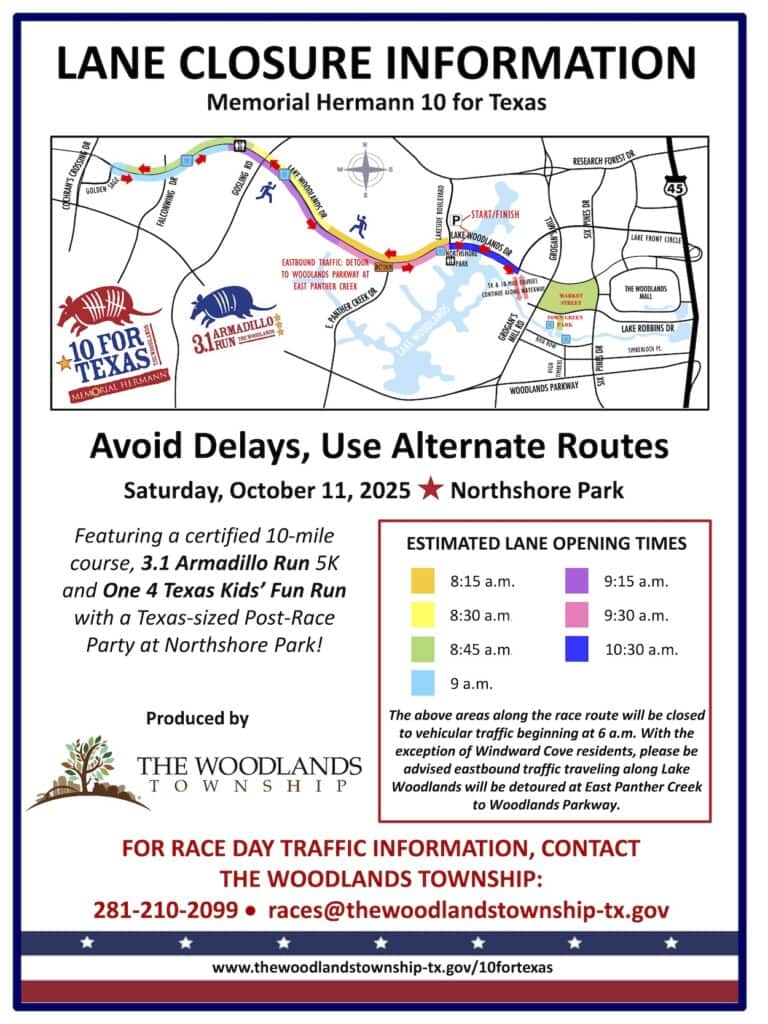 Residents are encouraged to avoid delays and use alternate routes around the race. Complete information on this event, including estimated lane openings and route maps, can be found online at thewoodlandstownship-tx.gov/10fortexas.