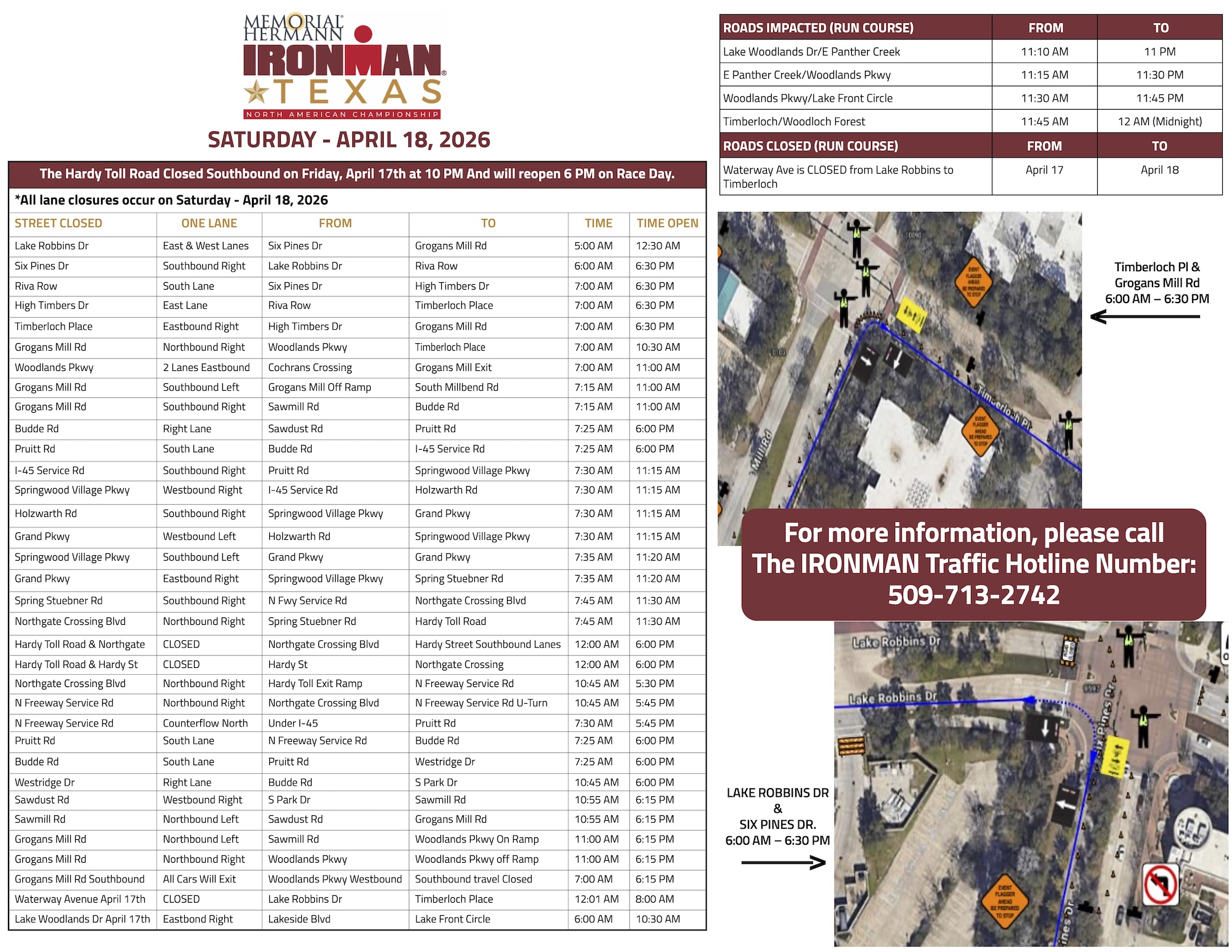 Traffic Impact of 2026 Memorial Hermann IRONMAN Texas in The Woodlands on Saturday, April 18